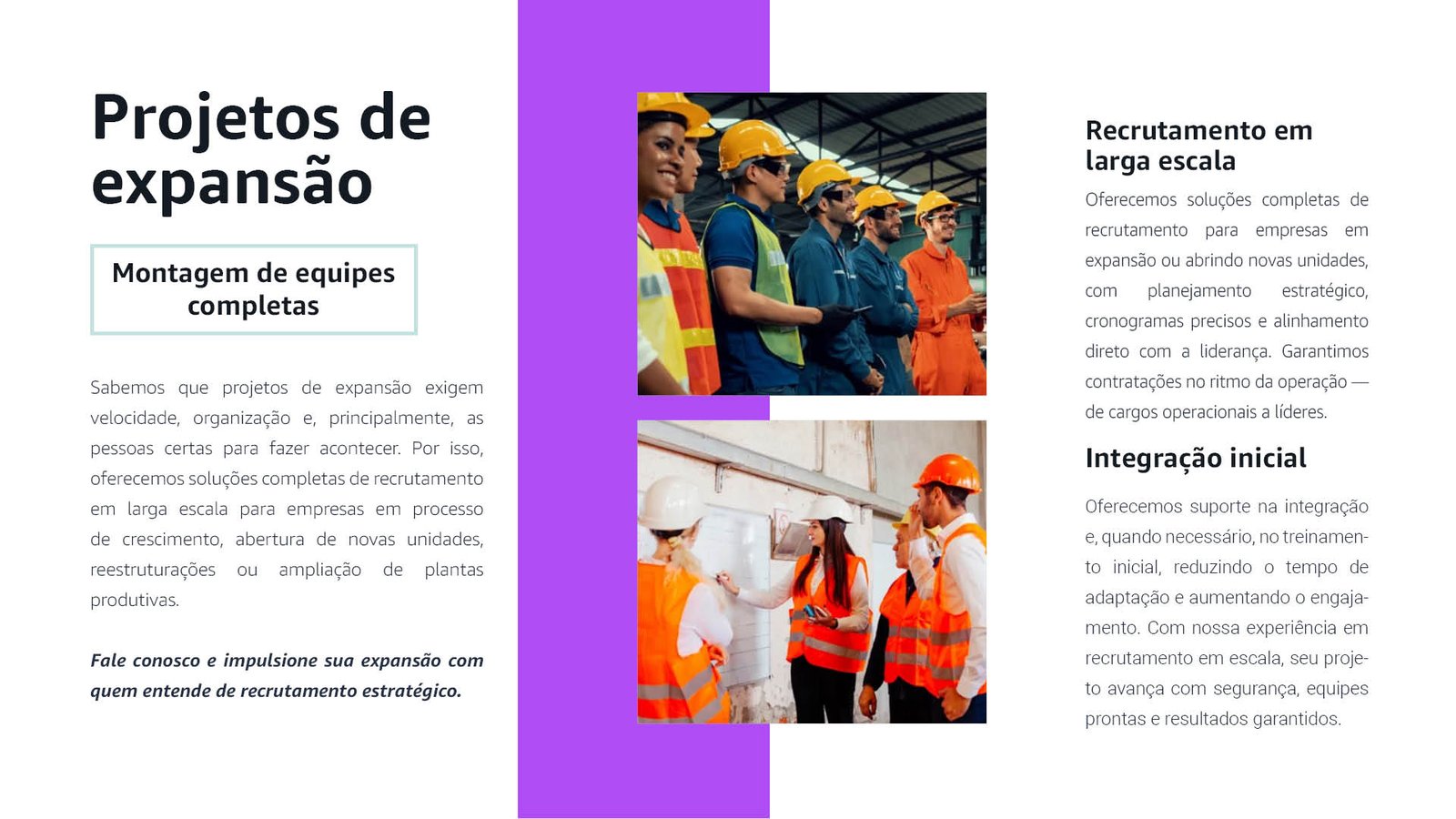 Velocidade, organização e as pessoas certas: oferecemos recrutamento em larga escala para empresas em crescimento, reestruturações ou novas unidades. Monte equipes completas com planejamento estratégico e integração inicial, garantindo resultados ágeis e sustentáveis.